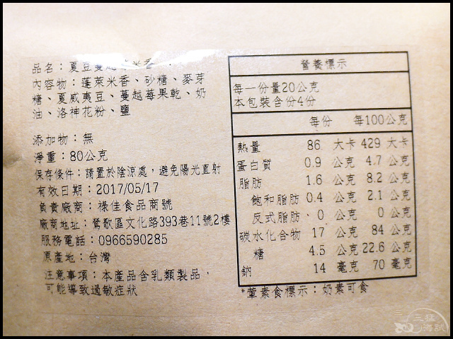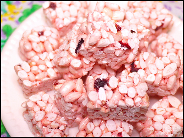 內容物:蓬萊米香、砂糖、麥芽糖、夏威夷豆、蔓越莓果乾、奶油、鹽、洛神花粉、海藻糖