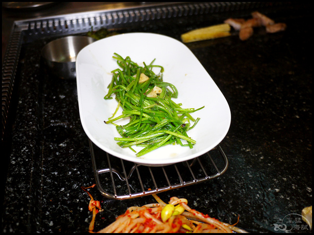 另外還有韭菜、泡菜豆芽、麻油蒜頭擺在石頭烤盤上,